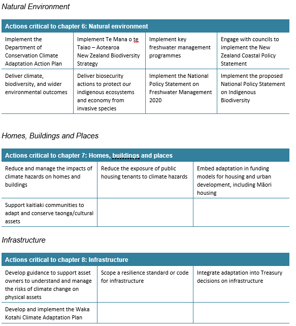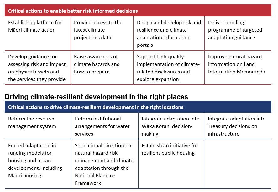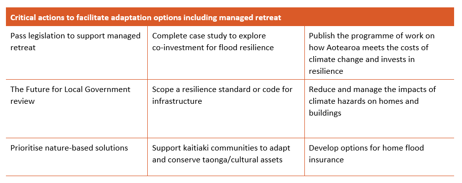 The Adaptation Plan provides comprehensive coverage of the range of issues that will eventuate with climate change; with many of the critical actions identified already underway.  However, key questions and guidance on critical areas including central government guidance for local authorities, the legislative form and funding of managed retreat and other adaptation options are yet to be fleshed out through further legislation and guidance, including upcoming resource management reform.