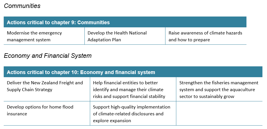 It also highlights issues relating to insurance retreat, disrupted supply chains, reduced financial stability and the fiscal impacts of extreme weather and sea-level rise.  Actions proposed include a new national Freight and Supply Chain Strategy to address resilience in the supply chain; changes to the Fisheries Act  to provide more agile and streamlined decision making in response to fish stock abundance due to the effects of climate change; an Aquaculture Strategy to support industry to adapt to climate change; consideration of whether to extend mandatory climate-related disclosure requirements to public entities; and the Reserve Bank integrating climate change considerations into its supervisory, stress testing and policy work.  It also includes work by the Earthquake Commission to develop options for home flood insurance issues.